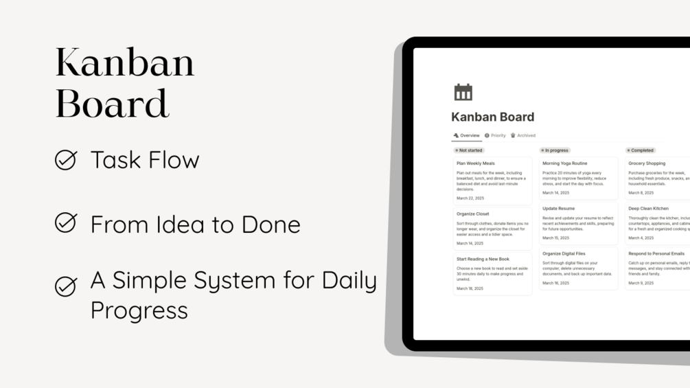 This Kanban board is designed to help you organize and track everyday tasks and personal goals, making it easier to manage your time and stay productive.